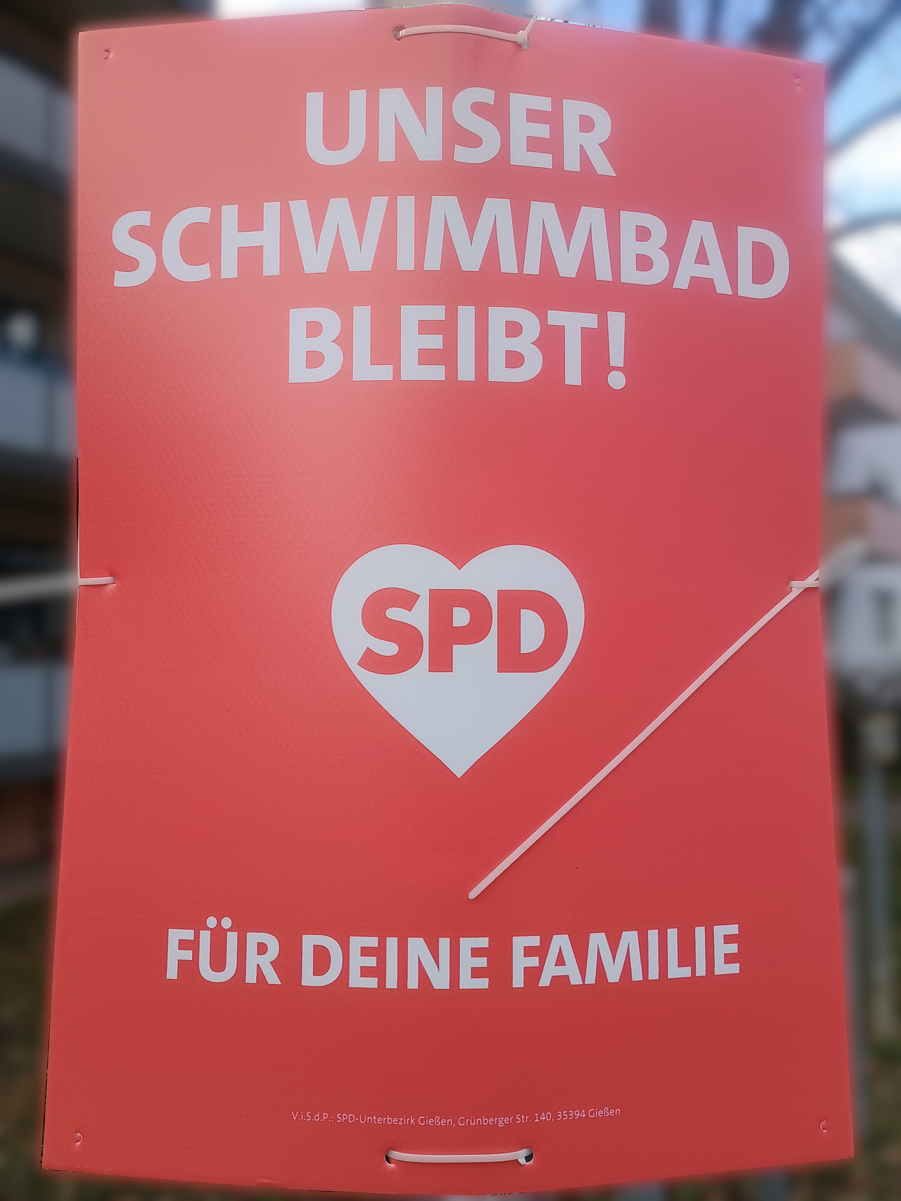 Wahlplakat bei der Kommunalwahl 2026 in Gießen von der Sozialdemokratische Partei Deutschlands mit dem Slogen „UNSER SCHWIMMBAD BLEIBT!“.