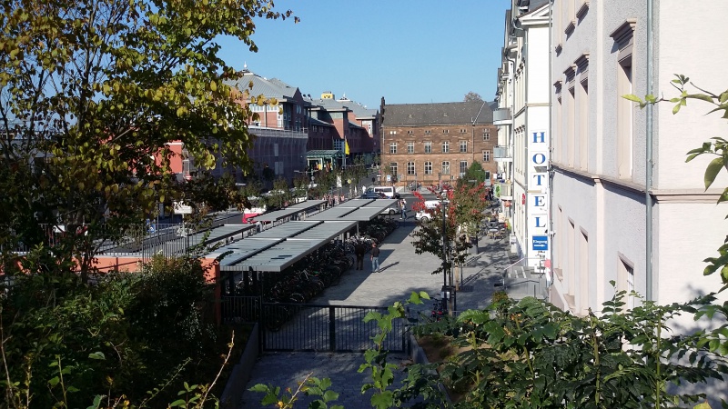 Urheber: Christian Oechler (PIRATEN-Fraktion Gießen) / Blick von der Historischen Treppe auf die Fahrradabstellanlage am Bahnhofsvorplatz.