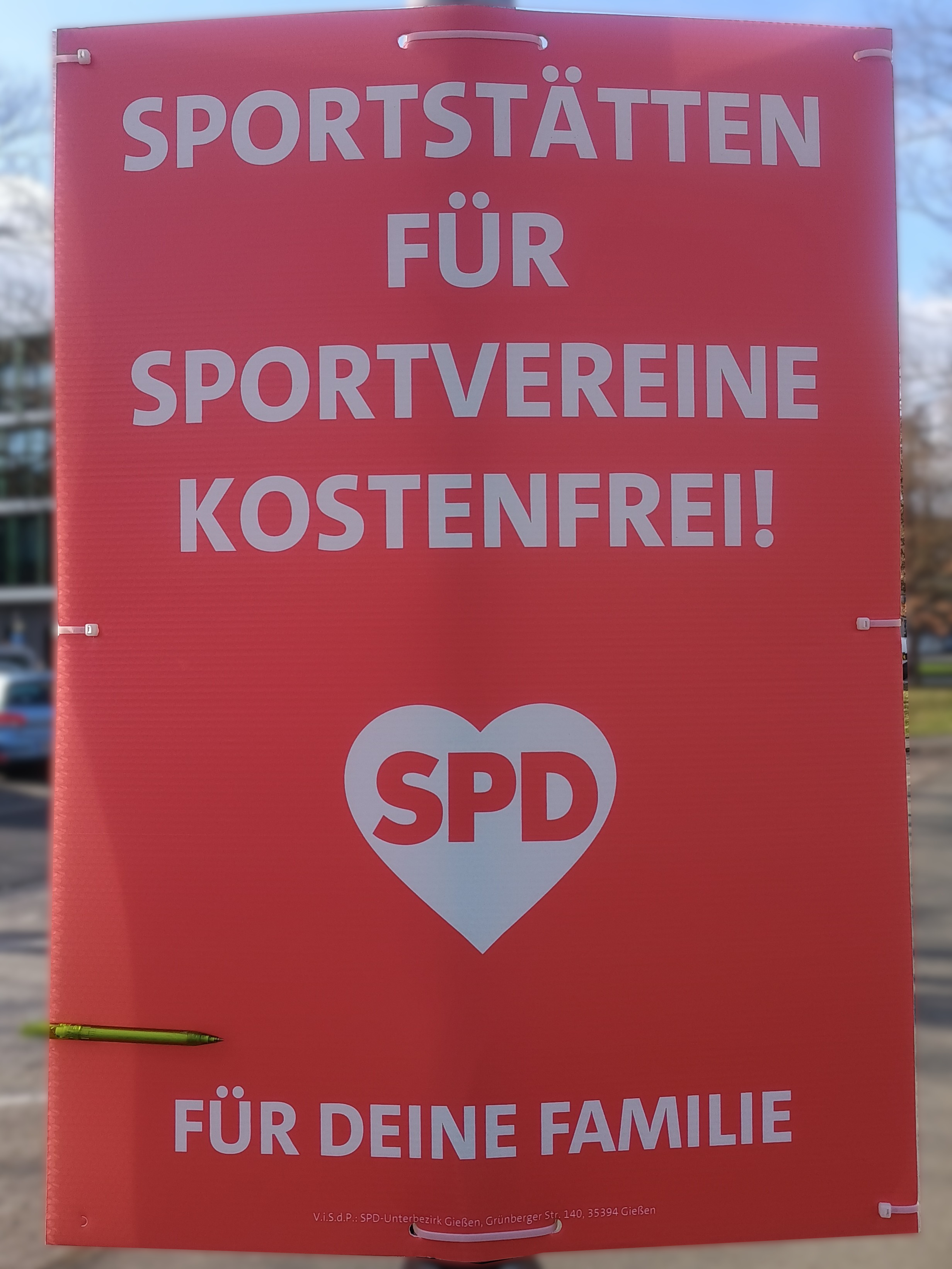 | 03:18, 13. Mär. 2026 | Wahlplakat „SPORTSTÄTTEN FÜR SPORTVEREINE KOSTENFREI!“ (SPD).jpg (Datei) | 971 KB | COechler | Wahlplakat bei der Kommunalwahl 2026 in Gießen von der Sozialdemokratische Partei Deutschlands mit dem Slogen „SPORTSTÄTTEN FÜR SPORTVEREINE KOSTENFREI!“. | 1 | |