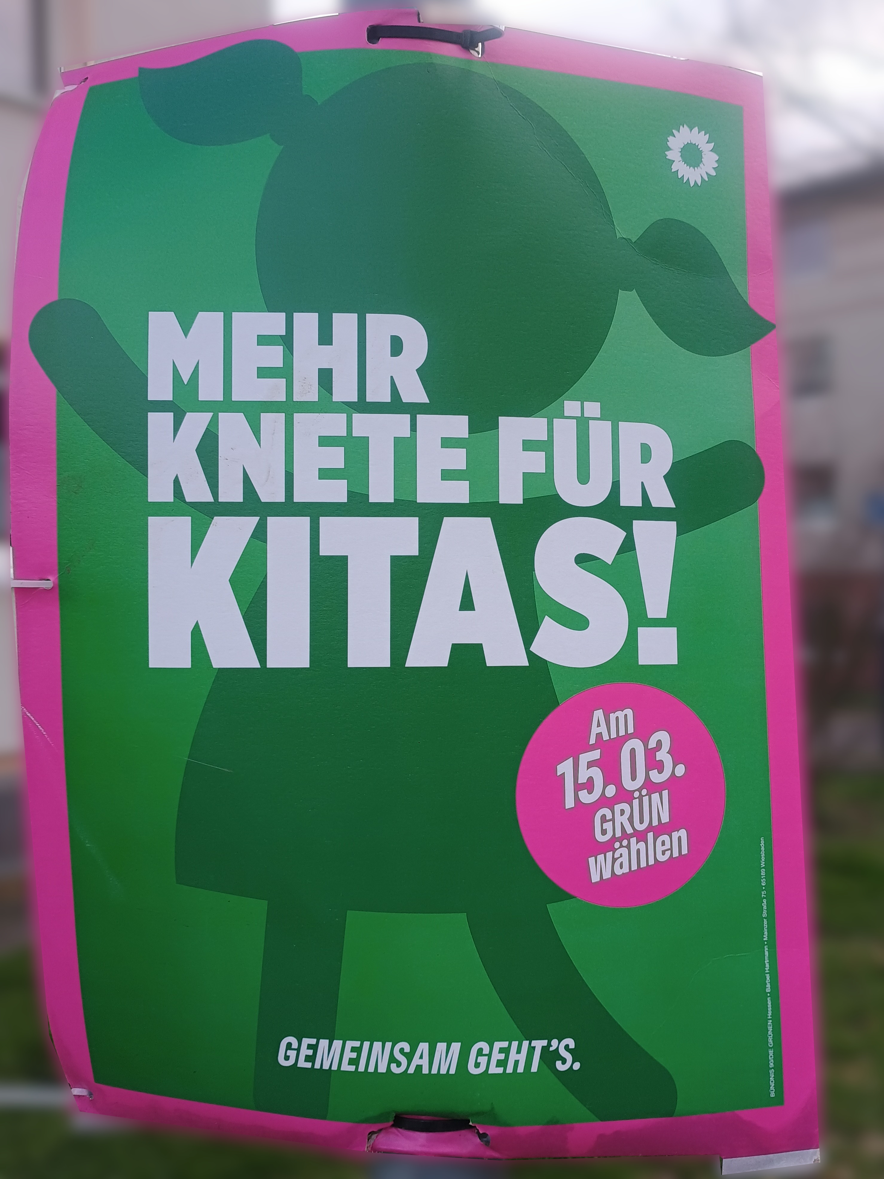 | 01:14, 13. Mär. 2026 | Wahlplakat „MEHR KNETE FÜR KITAS!“ (GRÜNE).jpg (Datei) | 1,52 MB | COechler | Wahlplakat bei der Kommunalwahl 2026 in Gießen von der Partei BÜNDNIS 90/DIE GRÜNEN mit dem Slogen „MEHR KNETE FÜR KITAS!“. | 1 | |