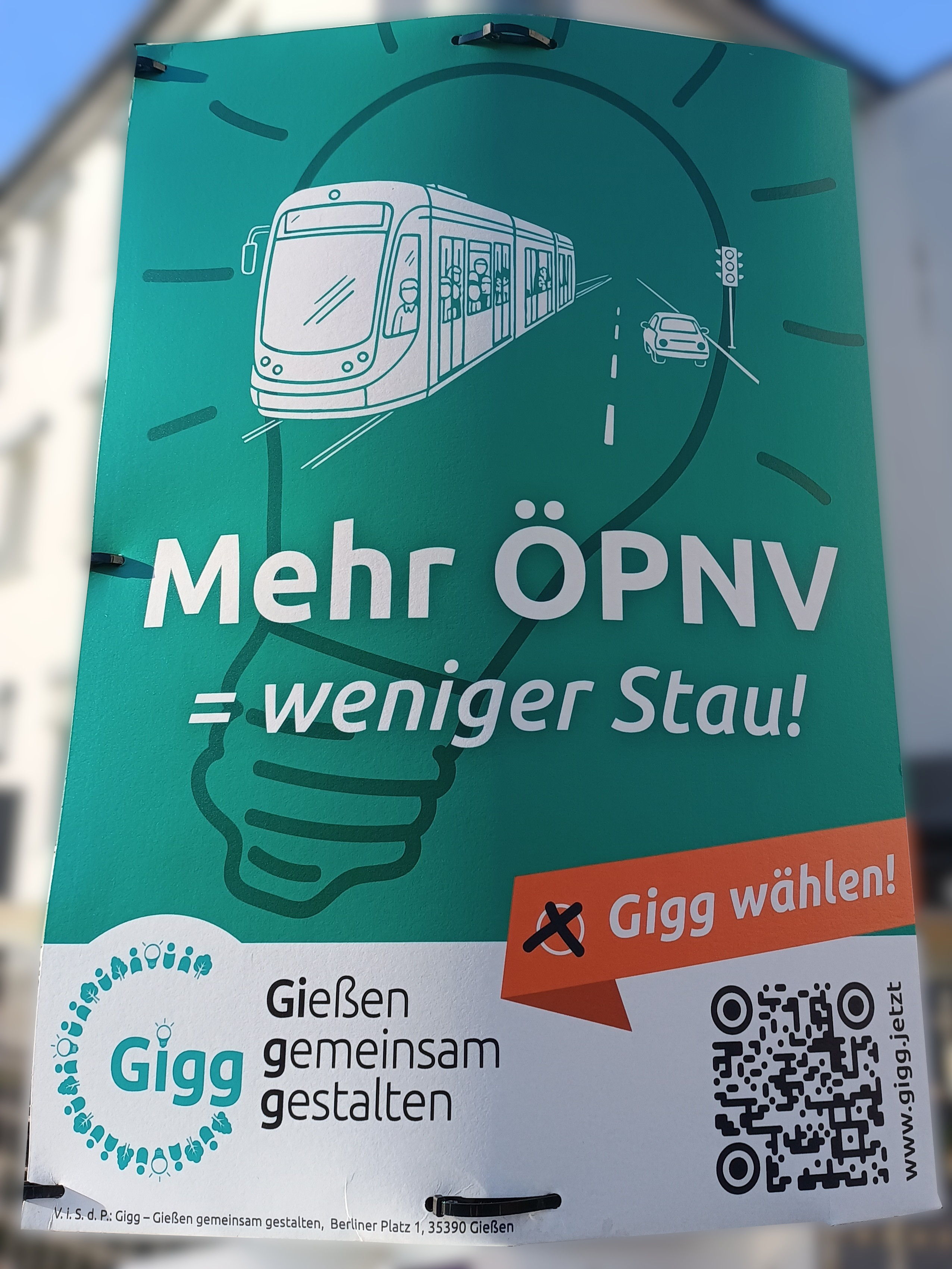 | 04:34, 13. Mär. 2026 | Wahlplakat „Mehr ÖPNV = weniger Stau!“ (Gigg).jpg (Datei) | 1,36 MB | COechler | Wahlplakat bei der Kommunalwahl 2026 in Gießen von der Wählervereinigung „Gießen gemeinsam gestalten“ mit dem Slogen „Mehr ÖPNV = weniger Stau!“. | 1 | |