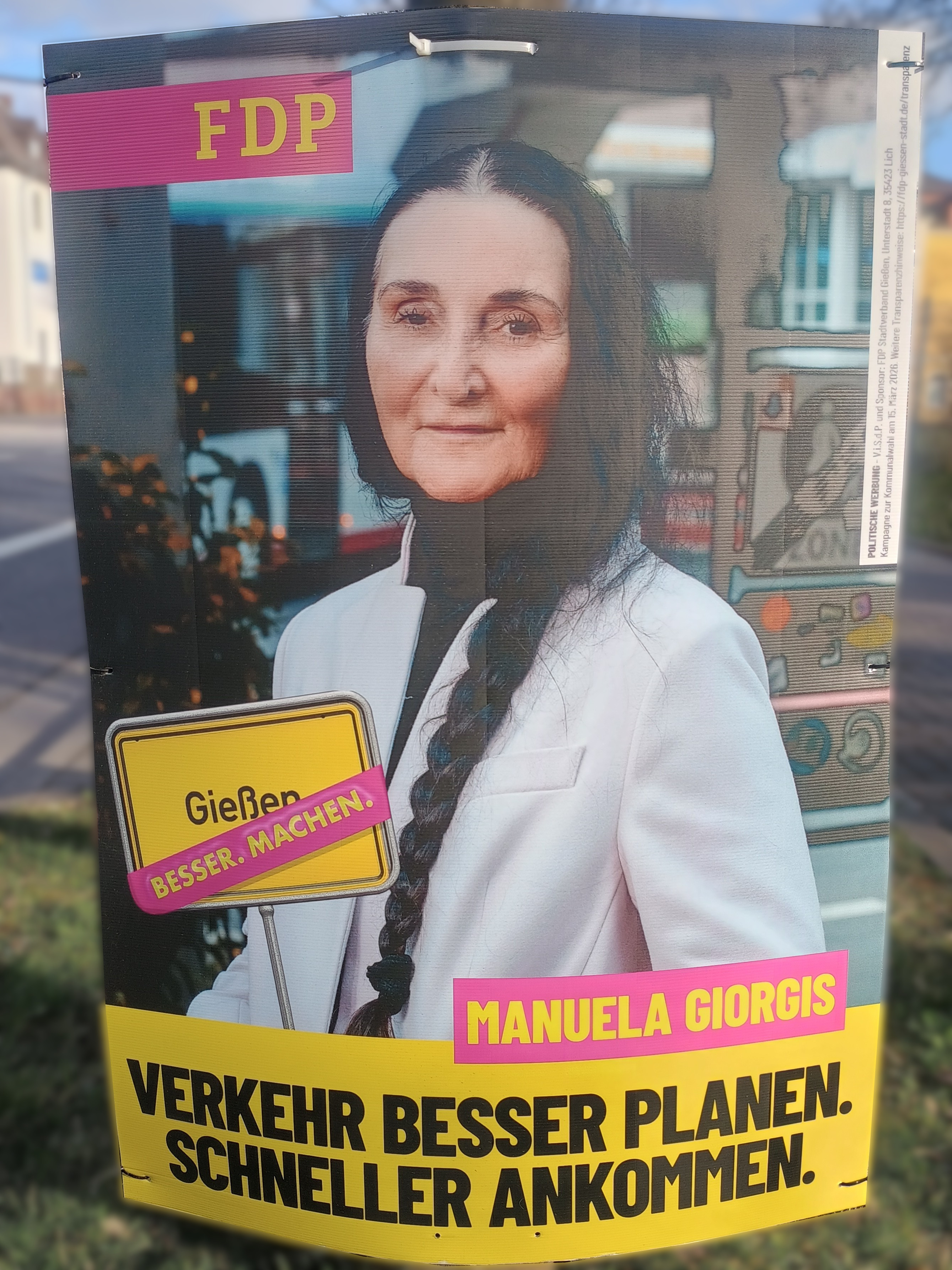 | 01:01, 13. Mär. 2026 | Wahlplakat „VERKEHR BESSER PLANEN. SCHNELLER ANKOMMEN.“ (FDP).jpg (Datei) | 1,85 MB | COechler | Wahlplakat bei der Kommunalwahl 2026 in Gießen von der Partei FDP mit dem Slogen „VERKEHR BESSER PLANEN. SCHNELLER ANKOMMEN.“. | 1 | |
