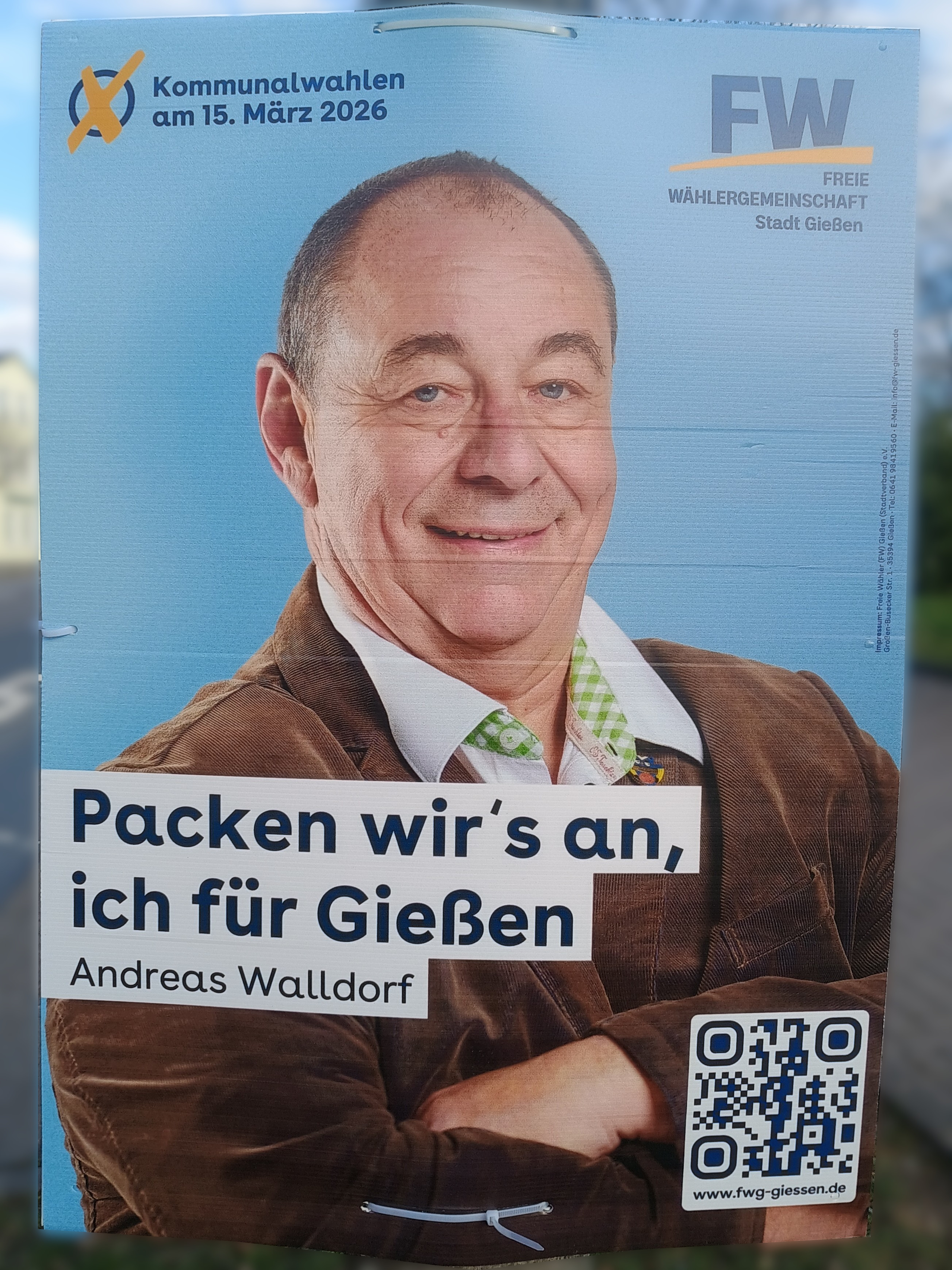 | 04:14, 13. Mär. 2026 | Wahlplakat „Packen wir's an, ich für Gießen“ (FW).jpg (Datei) | 2,05 MB | COechler | Wahlplakat bei der Kommunalwahl 2026 in Gießen von der Wählervereinigung Freie Wähler mit dem Slogen „Packen wir's an, ich für Gießen“. | 1 | |