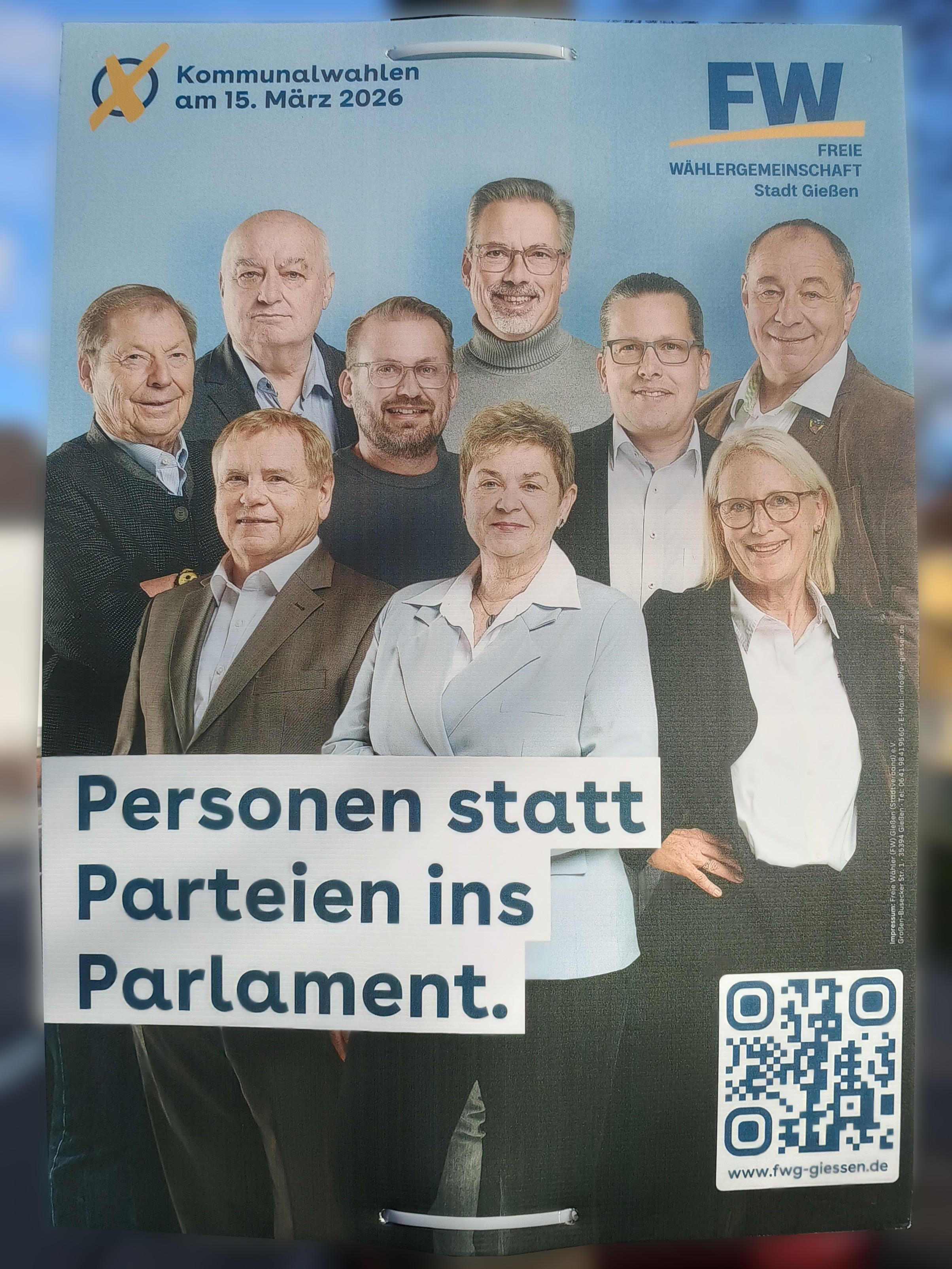 | 04:04, 13. Mär. 2026 | Wahlplakat „Personen statt Parteien ins Parlament.“ (FW).jpg (Datei) | 1,66 MB | COechler | Wahlplakat bei der Kommunalwahl 2026 in Gießen von der Wählervereinigung Freie Wähler mit dem Slogen „Personen statt Parteien ins Parlament.“. | 1 | |