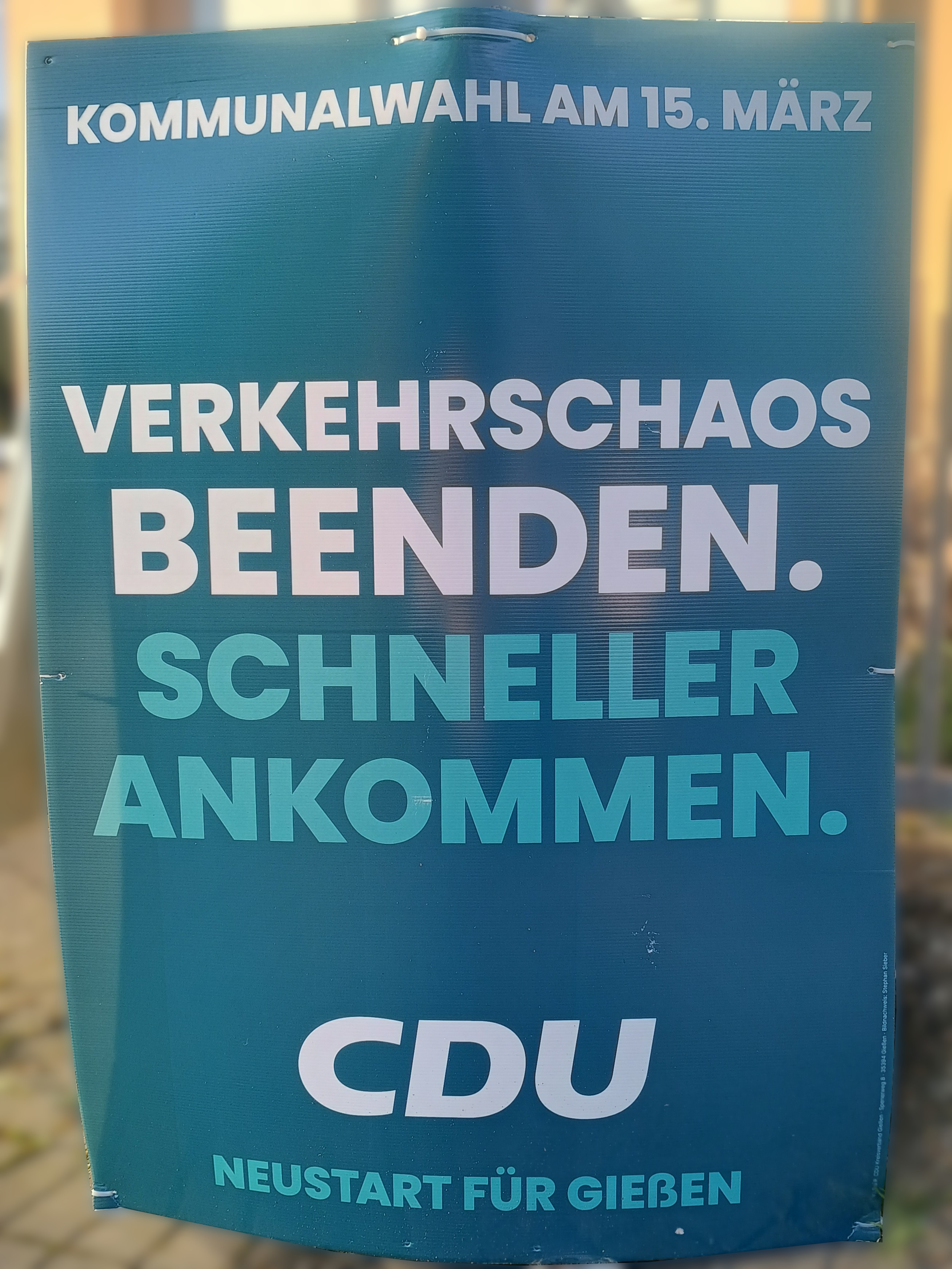 | 04:57, 13. Mär. 2026 | Wahlplakat „VERKEHRSCHAOS BEENDEN. SCHNELLER ANKOMMEN.“ (CDU).jpg (Datei) | 1,52 MB | COechler | Wahlplakat bei der Kommunalwahl 2026 in Gießen von der Partei Christlich Demokratische Union Deutschland mit dem Slogen „VERKEHRSCHAOS BEENDEN. SCHNELLER ANKOMMEN.“. | 1 | |