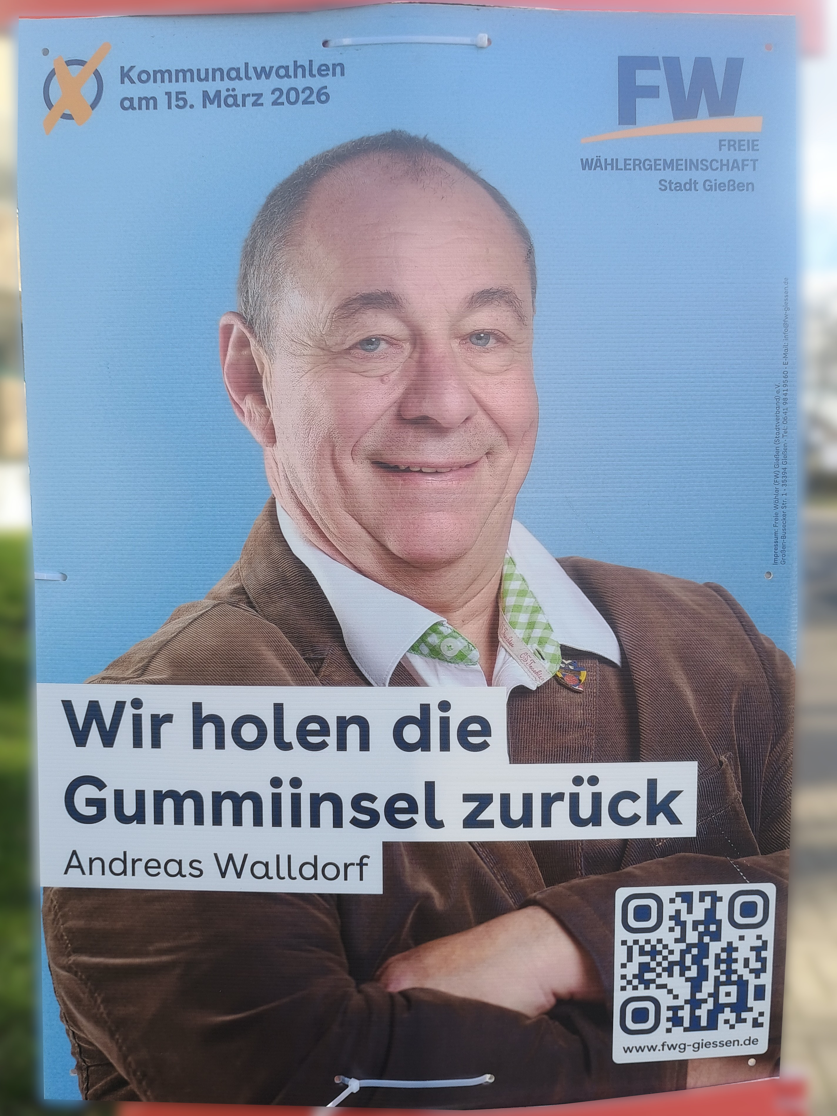 | 04:08, 13. Mär. 2026 | Wahlplakat „Wir holen die Gummiinsel zurück“ (FW).jpg (Datei) | 2,08 MB | COechler | Wahlplakat bei der Kommunalwahl 2026 in Gießen von der Wählervereinigung Freie Wähler mit dem Slogen „Wir holen die Gummiinsel zurück“. | 1 | |