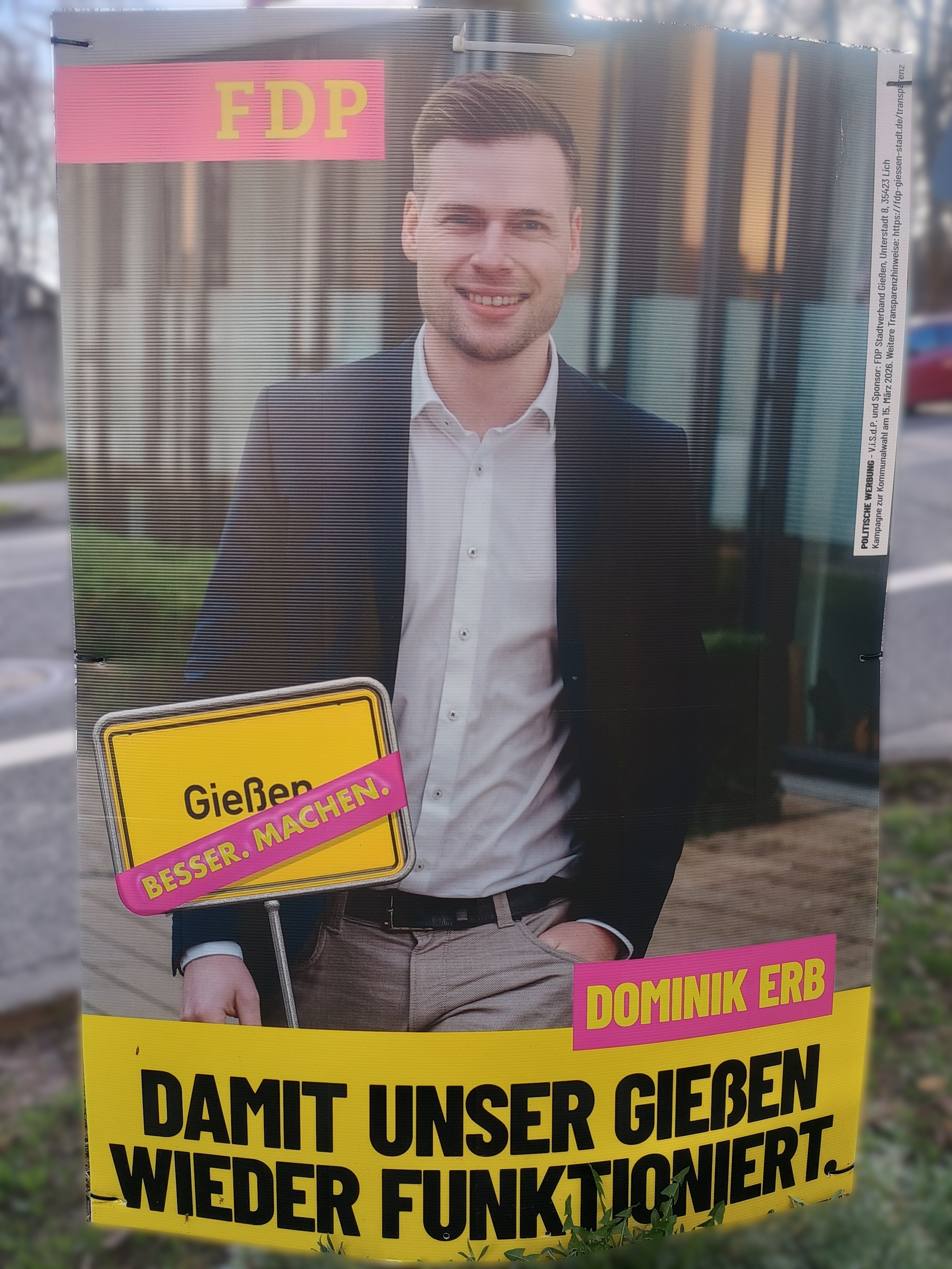 | 00:59, 13. Mär. 2026 | Wahlplakat „DAMIT UNSER GIEßEN WIEDER FUNKTIONIERT.“ (FDP).jpg (Datei) | 1,74 MB | COechler | Wahlplakat bei der Kommunalwahl 2026 in Gießen von der Partei FDP mit dem Slogen „DAMIT UNSER GIEßEN WIEDER FUNKTIONIERT.“. | 1 | |