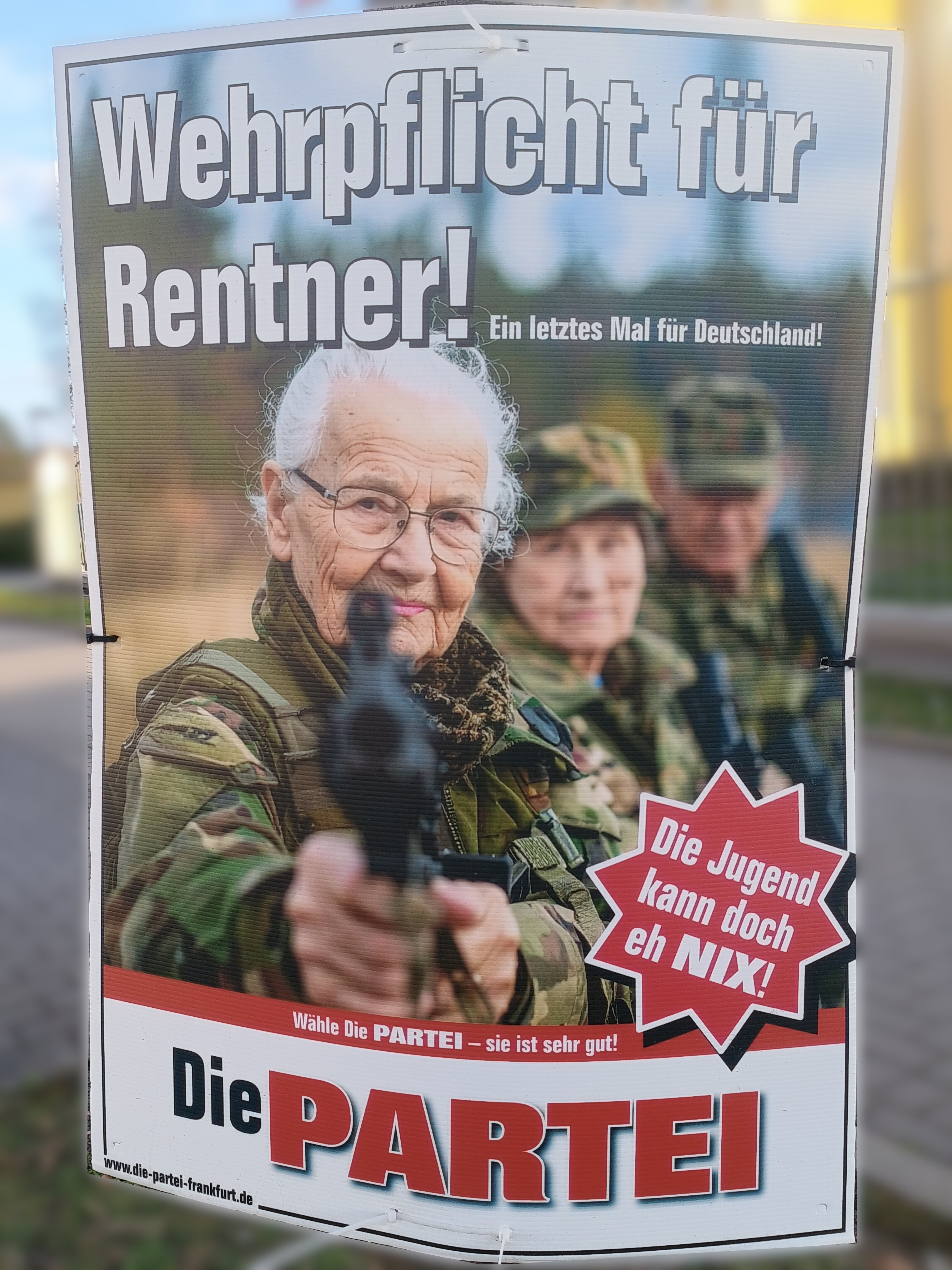 | 23:30, 12. Mär. 2026 | Wahlplakat „Wehrpflicht für Rentner!“ (Die Partei).jpg (Datei) | 1,78 MB | COechler | Wahlplakat bei der Kommunalwahl 2026 in Gießen von der Partei Die Partei mit dem Slogen „Wehrpflicht für Rentner!”. | 1 | |