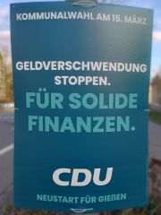 | 04:53, 13. Mär. 2026 | Wahlplakat „GELDVERSCHWENDUNG STOPPEN. FÜR SOLIDE FINANZEN.“ (CDU).jpg (Datei) | 1,45 MB | COechler | Wahlplakat bei der Kommunalwahl 2026 in Gießen von der Partei Christlich Demokratische Union Deutschland mit dem Slogen „GELDVERSCHWENDUNG STOPPEN. FÜR SOLIDE FINANZEN.“. | 1 | |