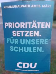 | 04:55, 13. Mär. 2026 | Wahlplakat „PRIORITÄTEN SETZEN. FÜR UNSERE SCHULEN.“ (CDU).jpg (Datei) | 1,08 MB | COechler | Wahlplakat bei der Kommunalwahl 2026 in Gießen von der Partei Christlich Demokratische Union Deutschland mit dem Slogen „PRIORITÄTEN SETZEN. FÜR UNSERE SCHULEN.“. | 1 | |
